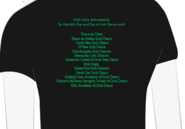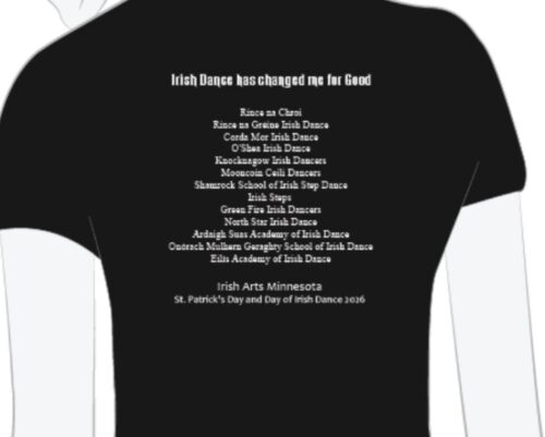 This year we have two designs available for our dancer shirts–choose your favorite, or get one of each! The 2026 Irish Arts MN Dancer shirt features all of the best of Irish dance – every school preforming at the 2026 Day of Irish Dance/ St. Patrick’s Day events will be listed on the back!